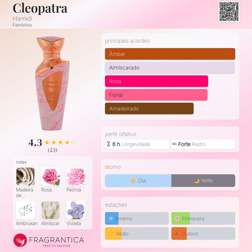 O Hamidi Legacy Cleopatra Eau de Parfum 100ml é uma fragrância árabe feminina sofisticada e poderosa, inspirada na elegância e na força de uma mulher icônica. Sua composição combina acordes florais e orientais com um fundo quente e envolvente, resultando em um aroma marcante, feminino e luxuoso, ideal para quem busca um perfume de presença e personalidade.