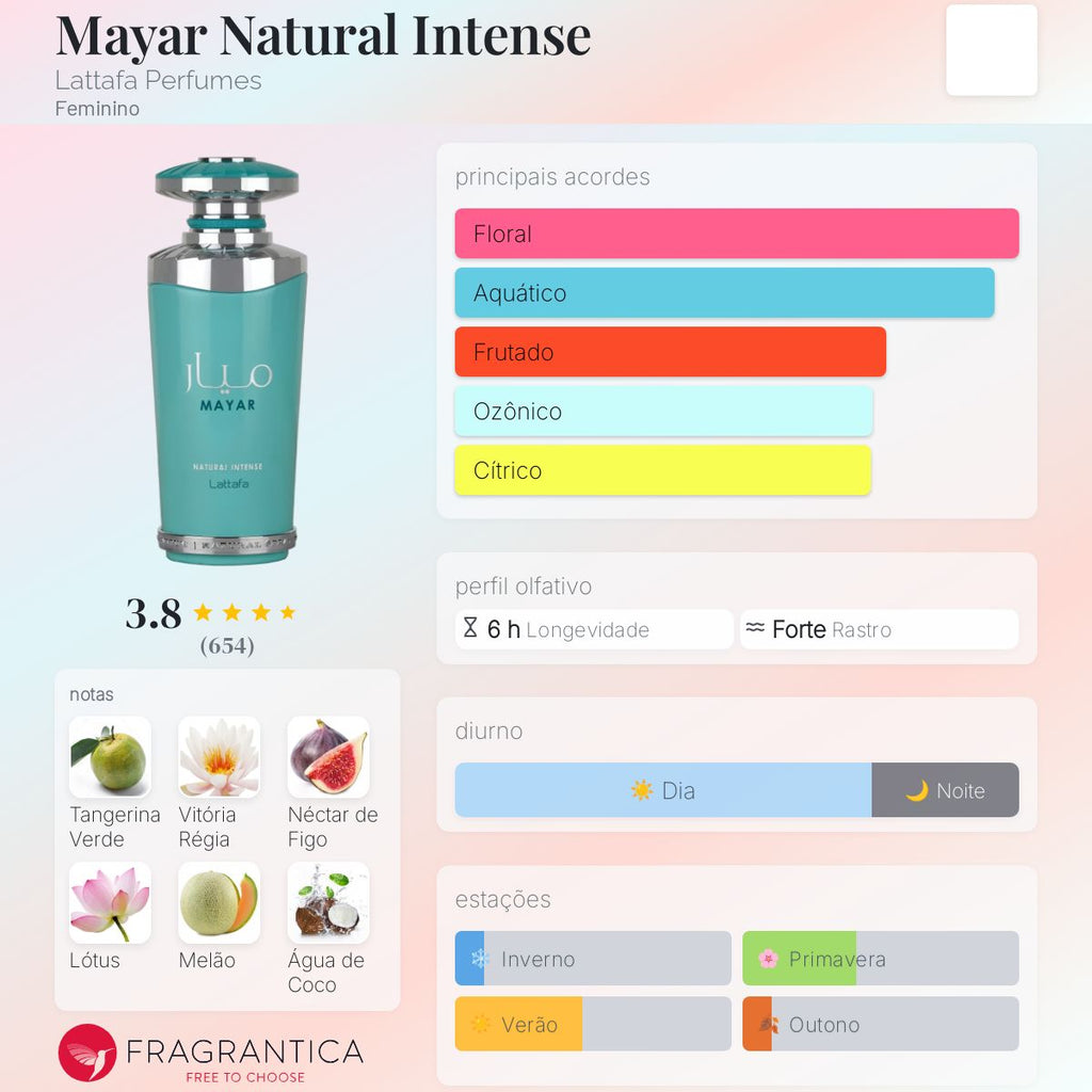 O Lattafa Mayar Natural Intense é um perfume árabe feminino com 100ml, que entrega uma fragrância floral frutada elegante, moderna e envolvente. Uma excelente escolha para mulheres que buscam um perfume versátil, feminino e confortável, com intensidade na medida certa para diversas ocasiões.