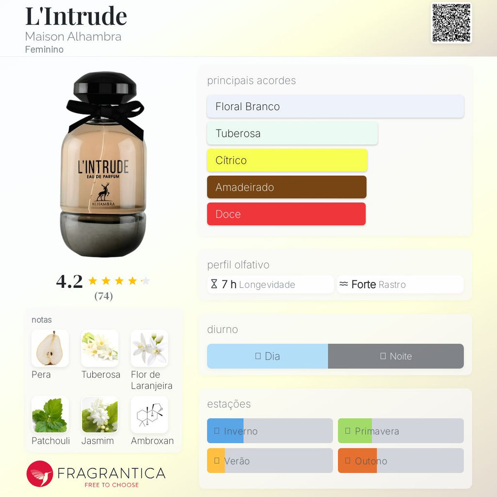O Maison Alhambra Intrude Eau de Parfum 100ml é uma fragrância árabe feminina intensa e sofisticada, criada para mulheres que gostam de perfumes marcantes e cheios de personalidade. Sua composição combina notas florais e orientais com um fundo quente e envolvente, resultando em um aroma poderoso, elegante e sedutor, ideal para quem busca presença e impacto.