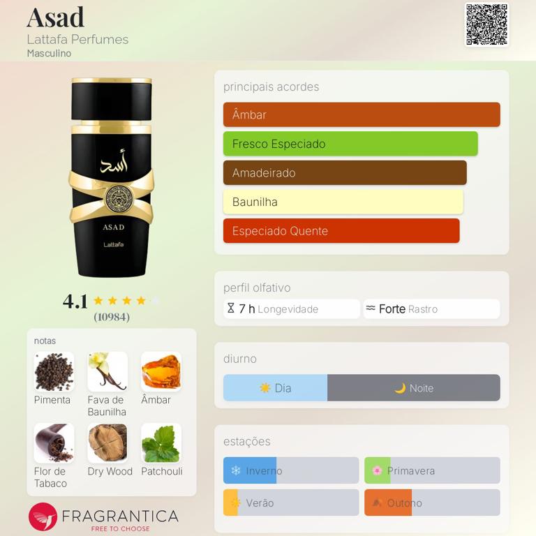 O Lattafa Asad Eau de Parfum 100ml é uma fragrância masculina intensa, poderosa e extremamente envolvente, criada para homens confiantes que gostam de perfumes marcantes e sofisticados. Com uma assinatura oriental moderna, combina notas especiadas, doces e amadeiradas de forma equilibrada, resultando em um aroma masculino quente, elegante e de forte presença.