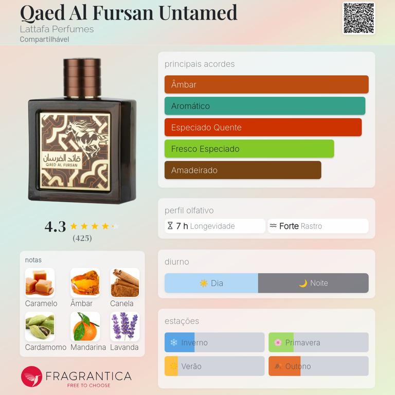 O Lattafa Qaed Al Fursan Untamed Eau de Parfum 90ml é uma fragrância masculina intensa, ousada e cheia de personalidade, criada para homens que gostam de perfumes marcantes e de forte presença. Esta versão Untamed apresenta uma assinatura oriental moderna, combinando notas especiadas, amadeiradas e levemente adocicadas, resultando em um aroma masculino poderoso, envolvente e sofisticado.