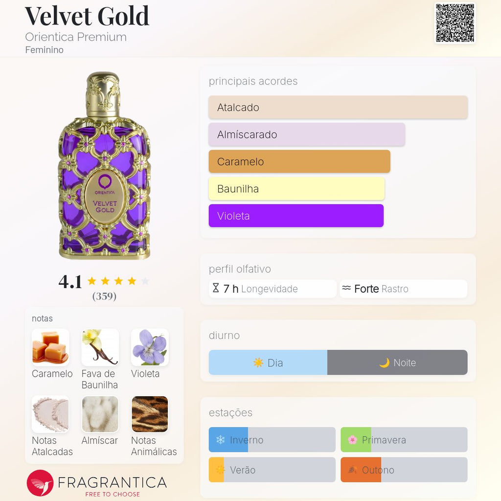 O Orientica Luxury Velvet Gold é um perfume árabe feminino em Eau de Parfum, com 80ml, que entrega uma fragrância sofisticada, aveludada e envolvente. Indicado para mulheres que buscam elegância e intensidade na medida certa, é uma excelente escolha para ocasiões especiais ou para quem gosta de perfumes com personalidade.