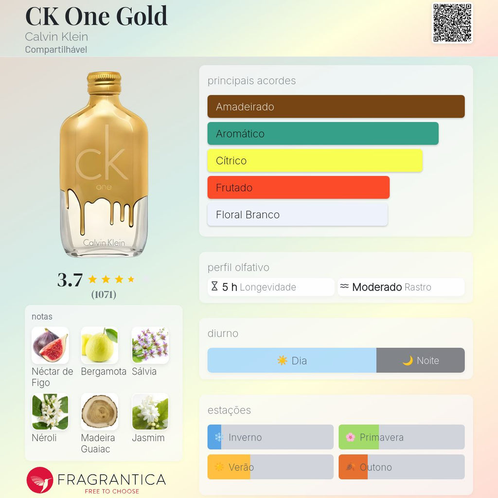 O Calvin Klein One Gold é um perfume compartilhável em Eau de Toilette, com 200ml, que entrega uma fragrância amadeirada aromática moderna, fresca e sofisticada. Uma excelente escolha para quem busca um perfume versátil, contemporâneo e elegante.