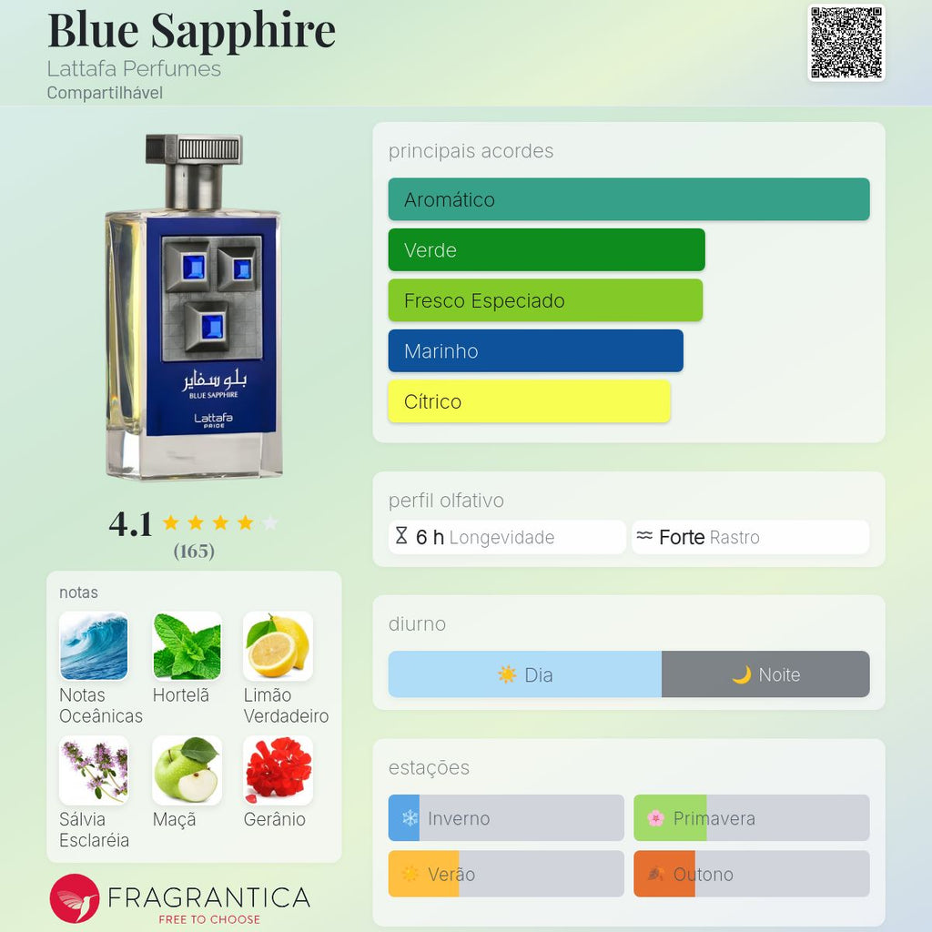 O Lattafa Blue Sapphire 100ml é uma fragrância compartilhável moderna, fresca e sofisticada, criada para quem aprecia perfumes elegantes com toque aromático e amadeirado. Sua composição equilibra frescor e profundidade, resultando em um aroma limpo, envolvente e extremamente versátil.