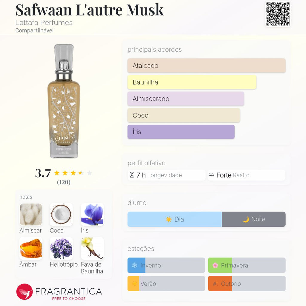 O Lattafa Safwann L’Autre Musk 100ml é uma fragrância compartilhável limpa, elegante e minimalista, criada para quem aprecia perfumes almiscarados sofisticados. Com uma composição suave e envolvente, entrega um aroma confortável, refinado e extremamente versátil.