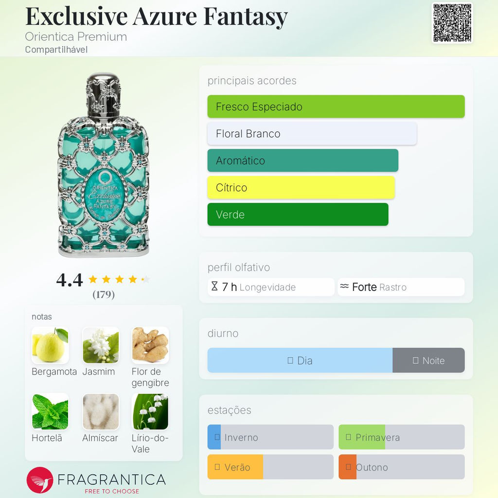O Orientica Azure Fantasy 80ml é uma fragrância compartilhável sofisticada, fresca e luxuosa, criada para quem aprecia perfumes modernos com toque elegante e refinado. Sua composição equilibra frescor aromático com notas envolventes, resultando em um aroma limpo, marcante e contemporâneo.