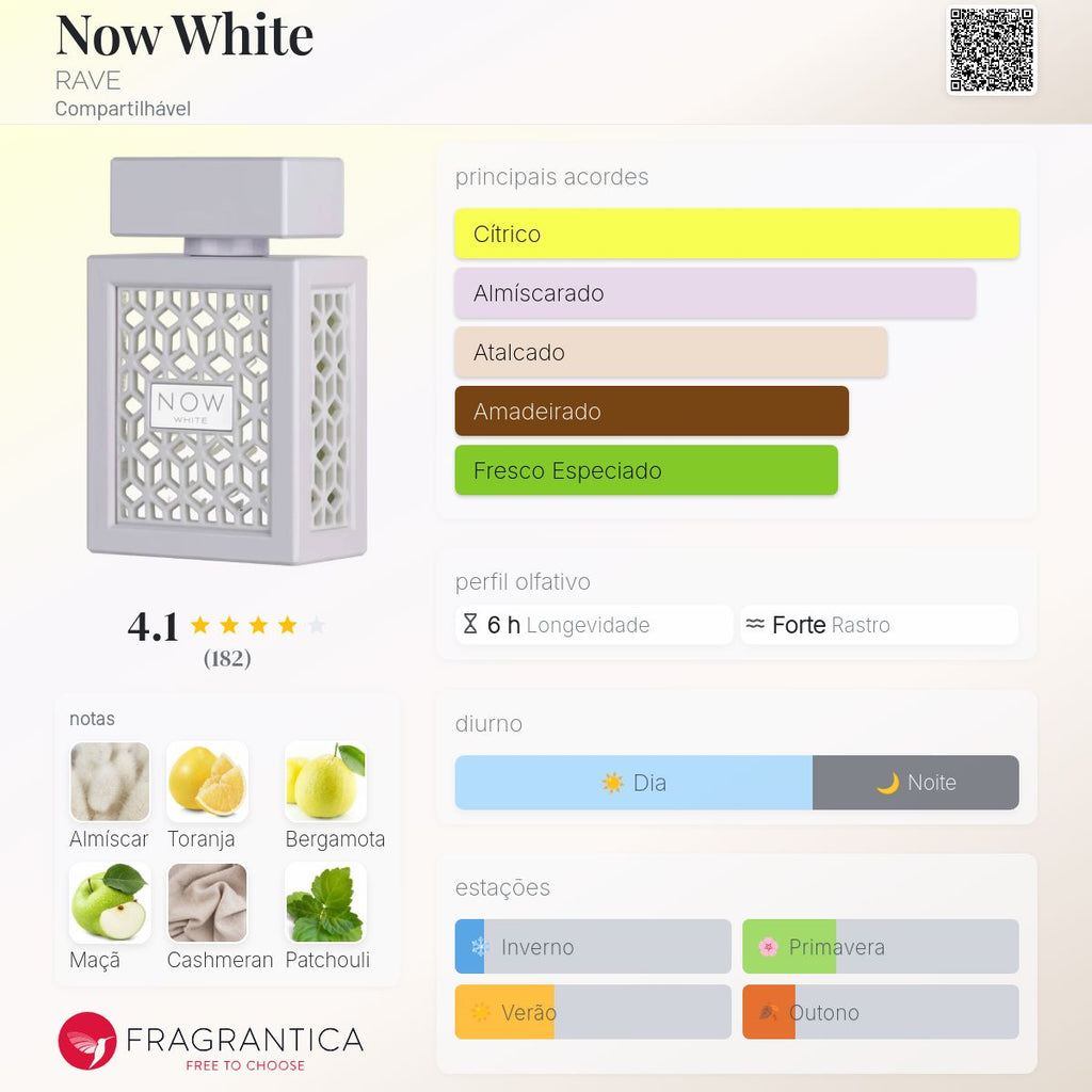 O Rave Now White 100ml é uma fragrância compartilhável fresca, leve e moderna, criada para quem busca um perfume limpo, elegante e fácil de usar. Sua composição aposta em notas suaves e equilibradas, entregando um aroma confortável, refrescante e versátil para o dia a dia.