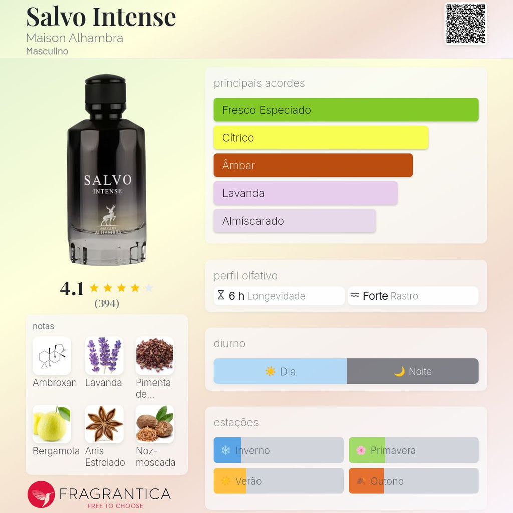 O Maison Alhambra Salvo Intense Eau de Parfum 100ml é uma fragrância masculina intensa, moderna e sofisticada, criada para homens que gostam de perfumes marcantes e cheios de atitude. Esta versão Intense entrega um aroma mais profundo e encorpado, combinando frescor aromático com um fundo amadeirado quente, resultando em um perfume masculino poderoso, elegante e envolvente.